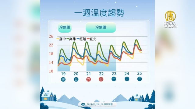【新唐人亞太台 2024 年 12 月 20 日訊】歡迎您收看12月20日的早安新唐人,我是趙庭譽,先來帶您關心天氣。氣象署針對新北、竹苗、宜花東、金門、南投8縣市發佈布低溫特報,今晨最低溫出現在苗栗縣三灣鄉,只有9.9度,預計白天北台灣高溫有機會回升到17、18度。不過,明天星期六,將有另一波冷氣團南下,桃園以北越晚越冷,預計將影響到下週一,低溫下探12度。提醒您務必做好保暖。帶您一起來看到國際媒體重要訊息。