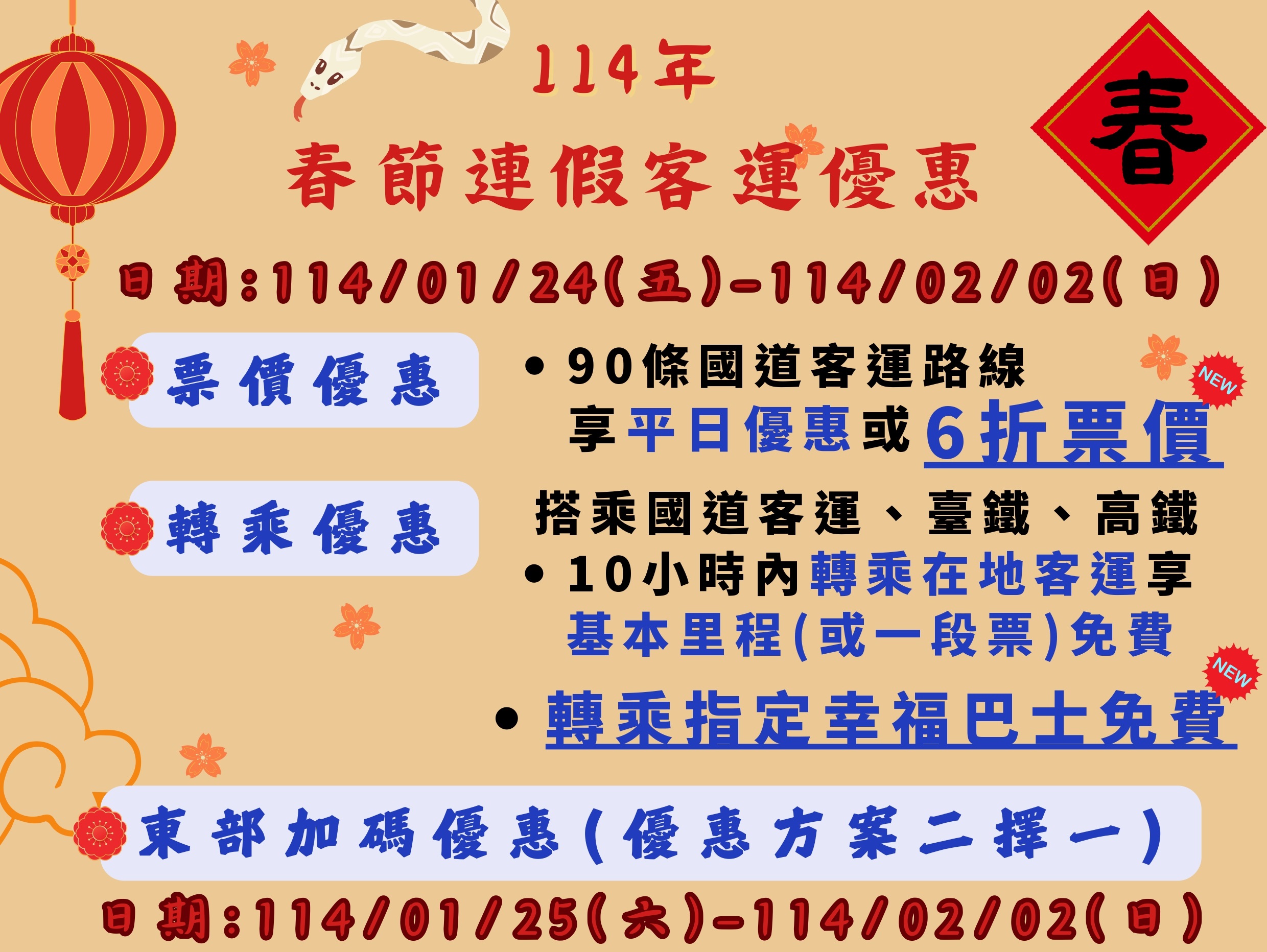 自114年1月25日0時起至114年2月2日24時止,宜花東限定好康再加碼,提供兩項優惠擇一使用:第一、「在地有腳活動租車優惠」,持東部國道客運票證,宜花東指定業者享租車優惠,再持租車憑證與客運去回程票根或購票證明,即享回程車票優惠(租汽車者折200元、機車100元);第二、持東部合法旅宿業住宿憑證及台灣好行套票,享東部指定國道客運路線4人同行1人免費,回程再享總票價折抵200元。