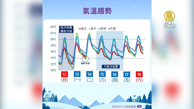 【新唐人亞太台 2025 年 01 月 13 日訊】歡迎您收看1月13日的早安新唐人,我是唐潔安,先來帶您關心天氣。冷氣團發溫,今天清晨,平地低溫前三名分別是:苗栗大河1.6度、新竹峨眉2.3度、新竹寶山2.8度。星期二晚上開始,另波冷氣團南下,北部及東半部有局部短暫雨,南部及中部山區,也有局部短暫雨。帶您一起來看到國際媒體重要訊息。