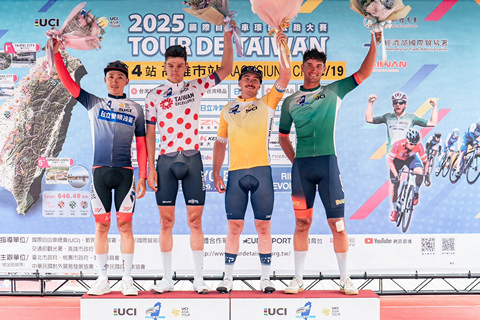 環台賽得獎選手,左起亞洲冠軍-藍衫 日本右京隊KOISHI Yuma小石祐馬、登山王-圓點衫 法國尤尼貝車隊 LOOCKX Lander 洛科克斯、個人總冠軍-黃衫 以色列職業隊 GILMORE Brady吉爾摩、衝刺王-綠衫 泰國盧賈伊隊 QUICK Blake快克。(圖/中華民國自由車協會 提供)