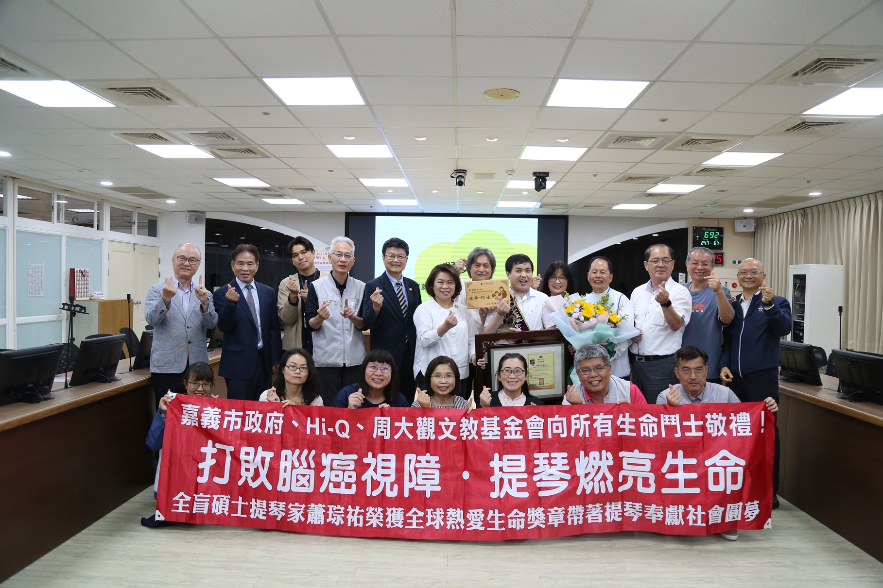 【新唐人亞太台 2025 年 05 月 12 日訊】周大觀文教基金會,今天(12日)首次在嘉義市公布全球熱愛生命獎章得主,並由嘉義市長黃敏惠、嘉義大學校長林翰謙等代表周大觀文教基金會,提前頒發2025年全球熱愛生命獎章,肯定全盲碩士提琴家蕭琮祐「打敗腦癌跳脫視障.帶著提琴奉獻社會」。