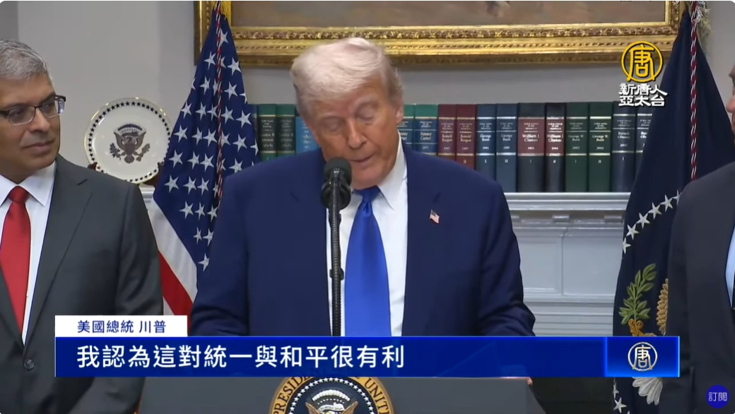 【新唐人亞太台 2025 年 05 月 13 日訊】美國總統川普12日在白宮記者會表示,中方同意全面開放,對兩國都是好事,「對統一與和平也非常有利」。對此,美國國務院表示,川普的發言明顯是針對美中貿易關係,美國對台灣政策不變。中華民國外交部也強調,美中談判並無觸及台灣議題,「美方對台承諾依然強勁,沒有改變。」