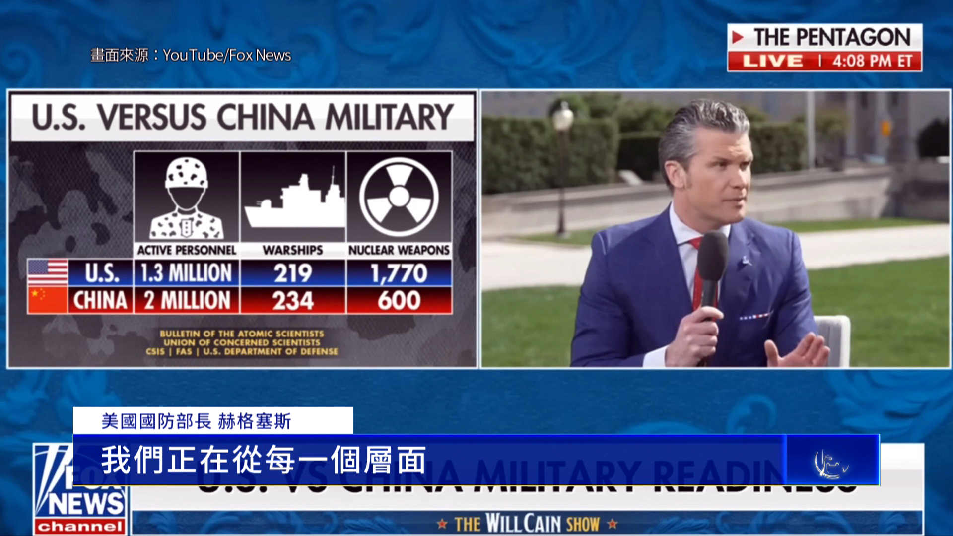 美國國防部長 赫格塞斯:「 我們正在從每一個層面,給它們(中共)製造困局。」