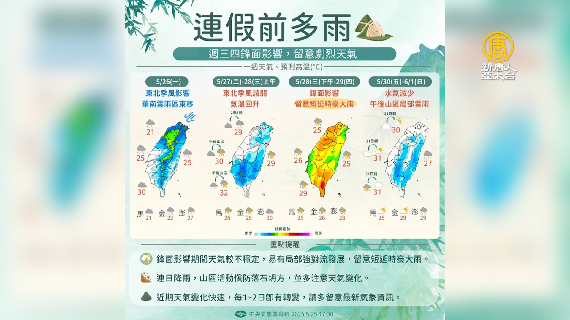 中央氣象署指出,今(26日)水氣仍偏多且東北季風影響,明(27日)氣溫回溫但東半部仍有雨,週三(28日)午後起到週四(29日)鋒面再影響,全台有雨,西半部慎防豪雨,週五(30日)起為端午節3天連假,水氣漸減少,各地偶見陽光,但南部及花東仍有陣雨。
