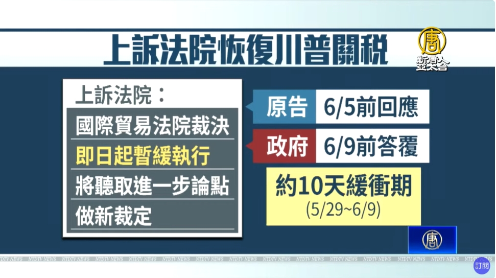 【新唐人亞太台 2025 年 05 月 30 日訊】新聞開始先來看到,美國川普政府的對等關稅政策,又出現新的轉折。聯邦上訴法院週四(29日)做出裁定,暫緩先前法院的命令,讓政府能夠繼續徵收關稅,並與各國談判,對中國的芬太尼關稅也可以暫時恢復。