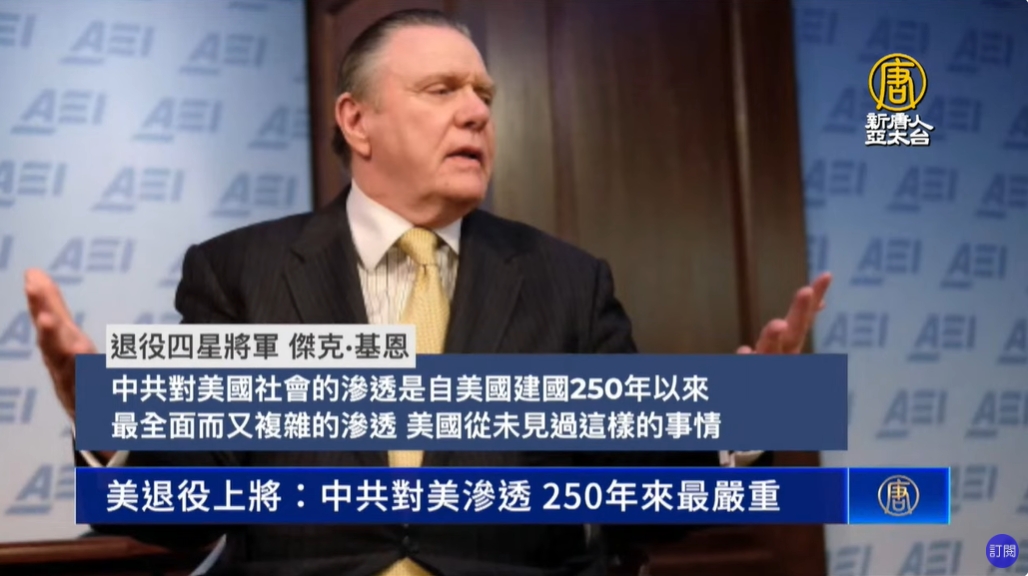 針對近期發生的幾名中國公民試圖將危險生物材料走私到美國的事件,美國退役四星將軍傑克·基恩((Jack Keane)),週二在福克斯新聞中表示,中共對美國社會的滲透是資美國建國250年以來,最全面而又複雜的滲透,美國從未見過這樣的事情。