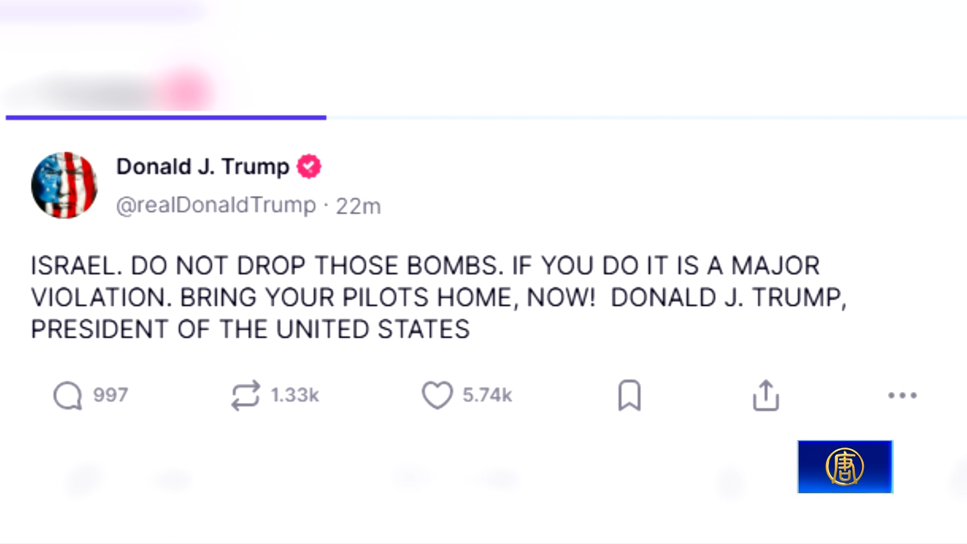 【新唐人亞太台 2025 年 06 月 24 日訊】中東最新消息,在美國總統川普宣布以伊完全停火後,以色列指控,伊朗朝以方發射飛彈,但伊朗否認。川普在台灣時間傍晚6時50分,在社群平台發文緊急警告以色列,「別扔炸彈,否則就構成嚴重違反協議」,「現在就把你們的飛行員帶回家。」,目前,川普正準備搭飛機去荷蘭參加北約峰會,他對媒體表示,以色列跟伊朗都違反停火協議,他對持續的攻擊行為表示失望。