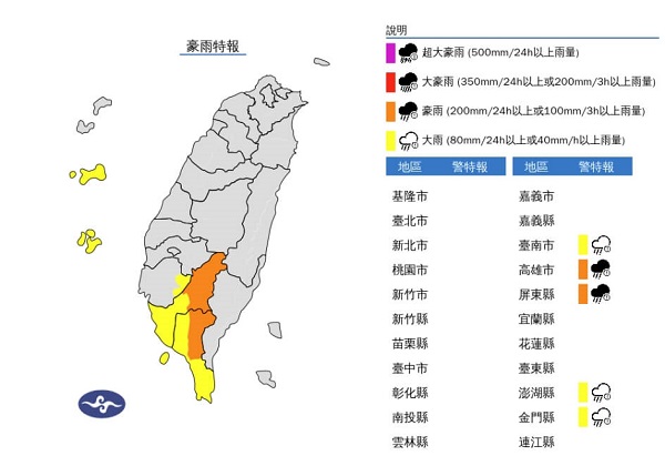 澎湖、金門、高雄、屏東地區及台南山區有局部大雨發生的機率,請注意雷擊及強陣風,低窪地區留意積淹水;連日降雨,山區需留意土石鬆軟、地滑、崩塌、落石及土石流,應避免前往山區。