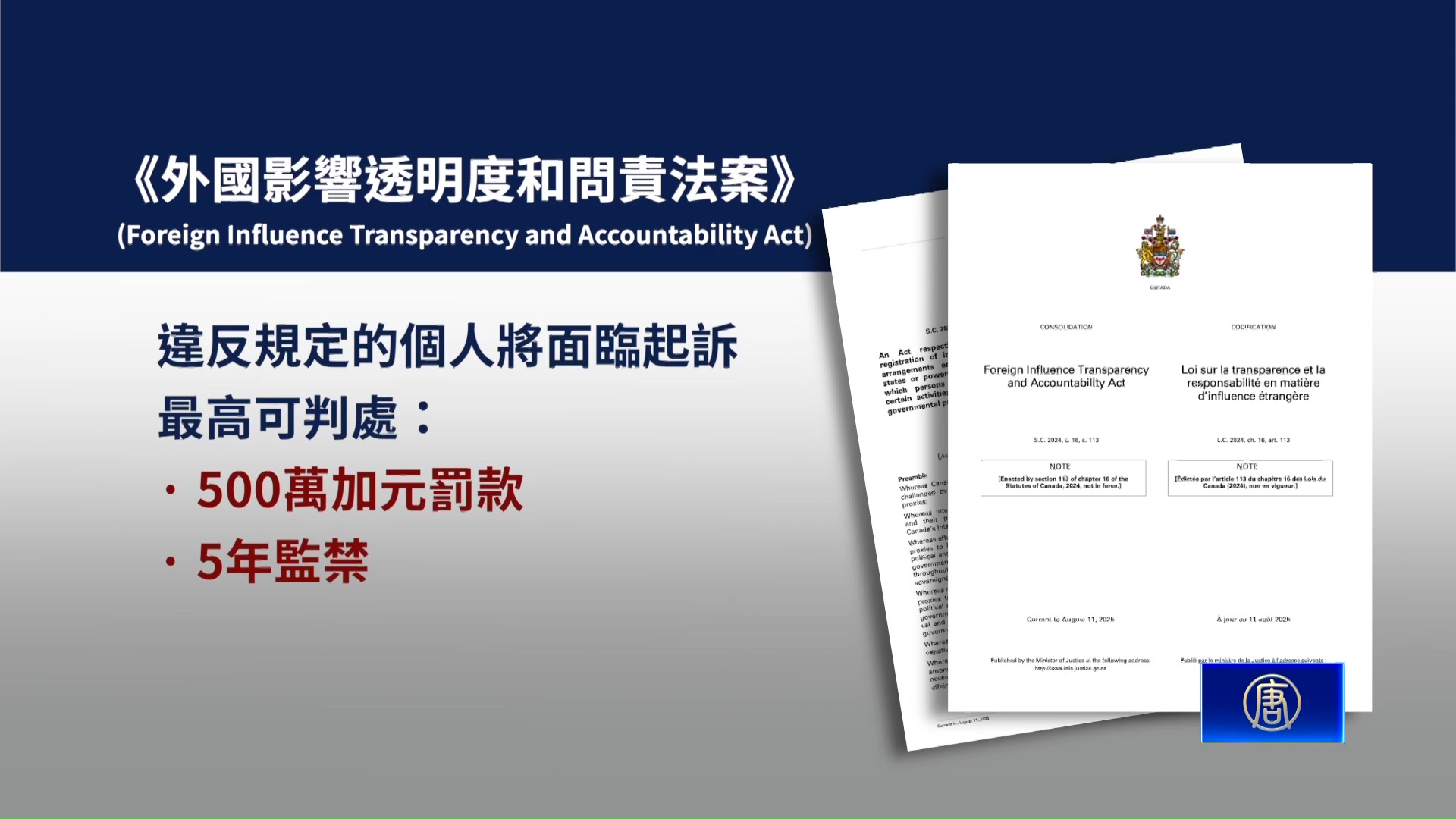 根據《外國影響透明度和問責法案》,違反規定的個人將面臨起訴,最高可判處500萬加元罰款或5年監禁。