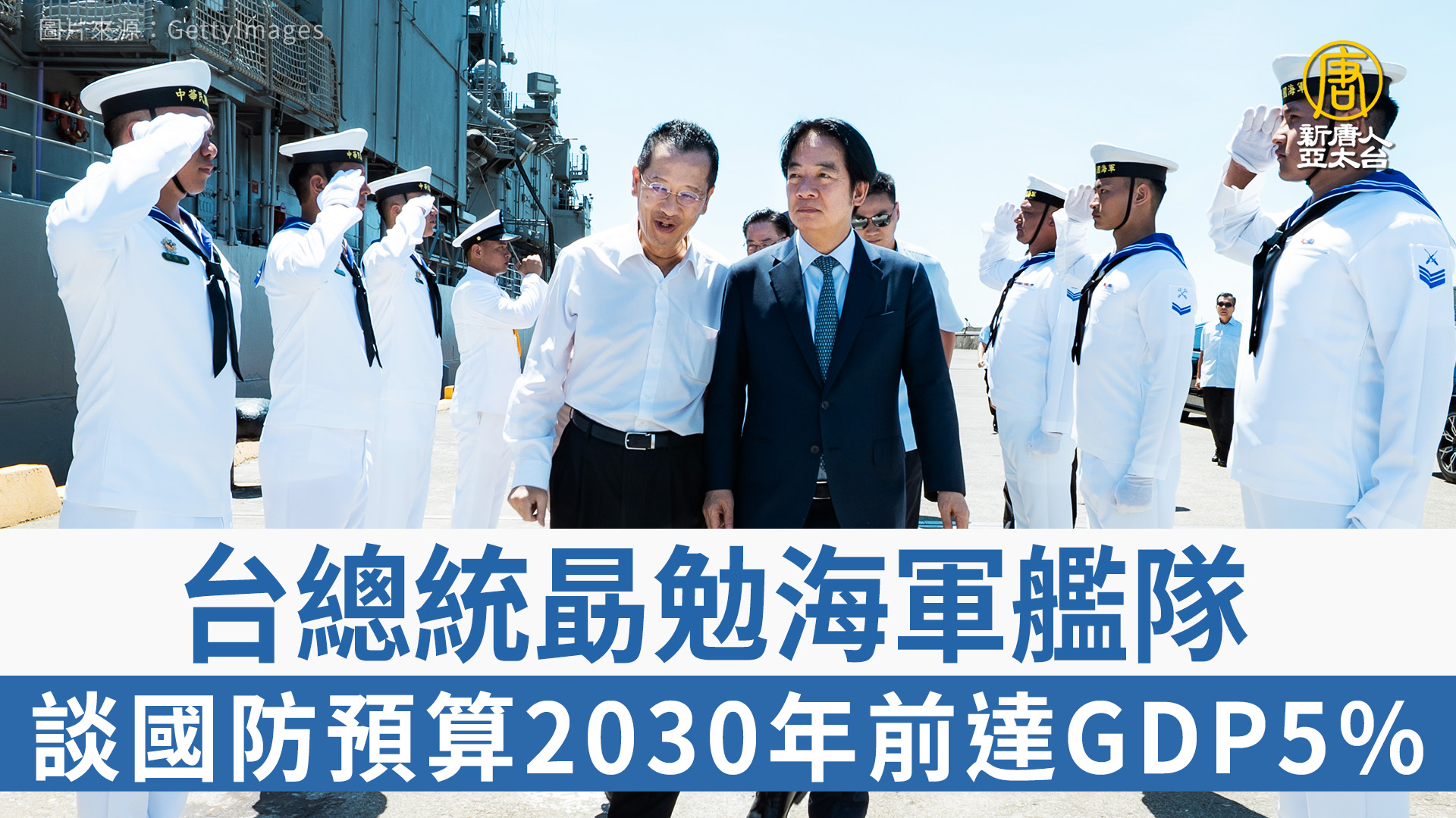 【新唐人亞太台 2025 年 08 月 22 日訊】歡迎回來。中華民國總統賴清德今天上午前往宜蘭,勗勉海軍一六八艦隊。賴清德登艦視導,並表示,台灣明年度國防預算,比照北約標準將占GDP的3.32%,並可望在2030年以前達到GDP的5%。他還宣示,籌措的武器裝備,包含下一代巡防艦、無人載具的獲得,政府都會支持,堅定做國軍後盾。
