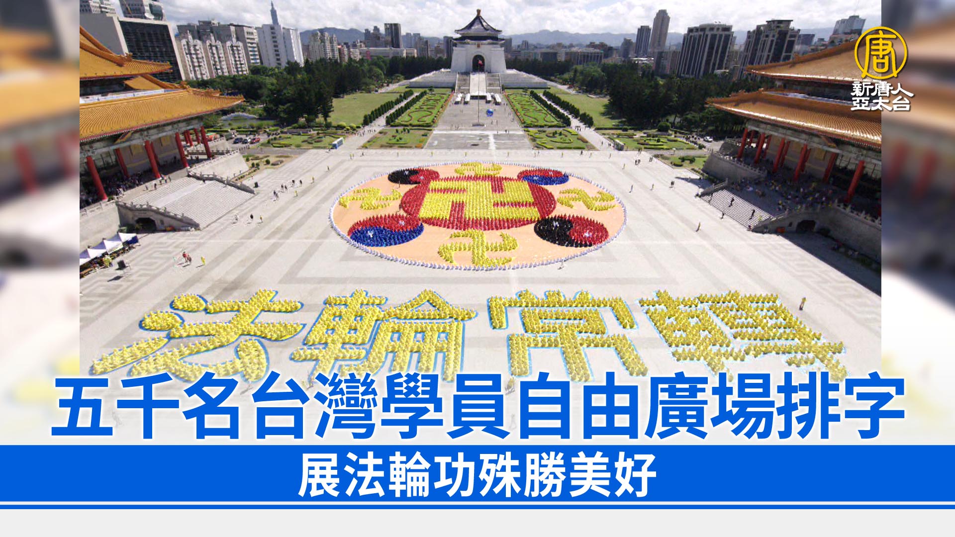 五千名來自台灣的部分法輪功學員,頂著艷陽高溫,整齊劃一的按照顏色入列坐定,在中正紀念堂的廣場上,排出長90公尺、寬87公尺的巨型法輪圖形,以及「法輪常轉」字樣,從高空俯瞰相當壯觀殊勝,也有來自日本、韓國與印尼的學員,專程來到台灣參與。