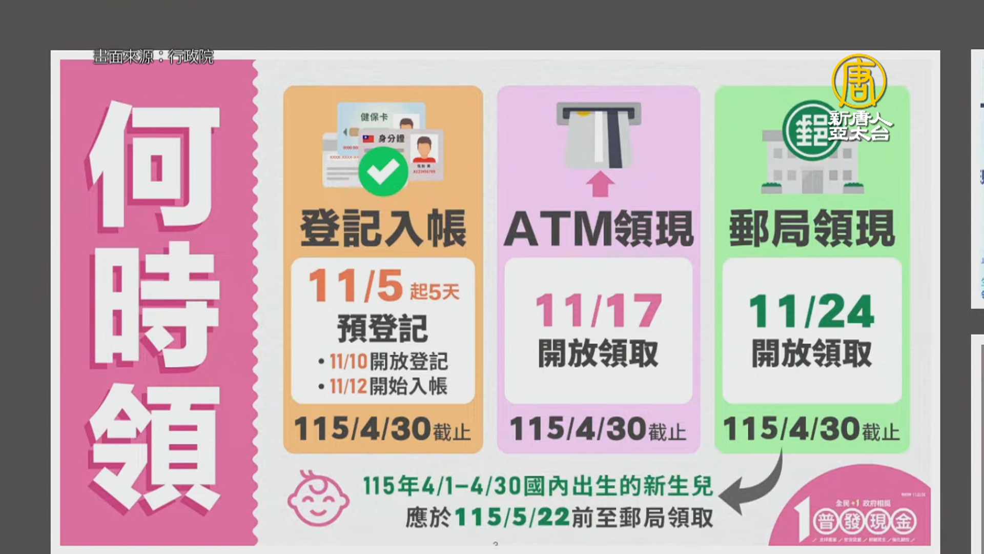 領取時間至2026年4月30日止,2026年4月出生新生兒領取時間至2026年5月22日止。