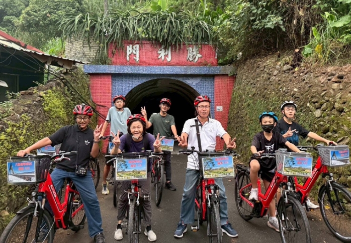 活動展開「鐵馬走讀」,以電輔車悠遊 185 沿山公路秘境,穿越紅藍馬賽克牆的勝利門隧道、探訪滿載歲月痕跡的「隘食農園食光穿越牆」、巨大紅心為地標的「愛聊食堂」打卡點(屏東縣政府 提供)