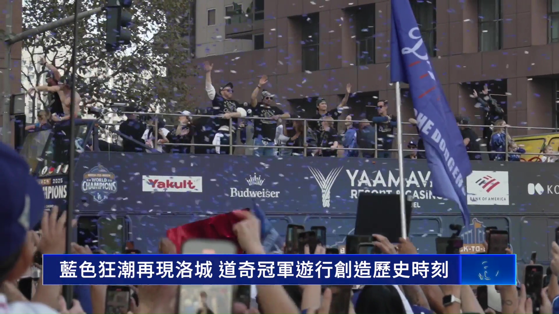 記者 克里斯蒂娜·科羅納:「我們現在在洛杉磯市中心,道奇隊正在舉行盛大的遊行,慶祝連續兩次贏得世界大賽冠軍。球迷們早早就來排隊,只為占到一個好地方,看到最喜歡的球員乘坐雙層巴士經過格蘭大道。從歡呼、著裝到跳舞,每個道奇隊的球迷都沈浸其中。」