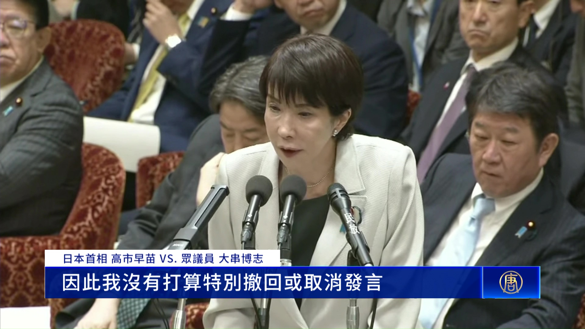 日本首相 高市早苗 VS. 眾議員 大串博志:「關於我前幾天的答辯,是在回應關於台灣海峽局勢的提問時,針對各種可能的情境做出的說明。至於哪些情況會被認定為存立危機事態,要根據實際發生的具體情況來看,政府會綜合所有情報做出判斷,因此政府一直以來的立場並沒有改變。(也就是說不會撤回或取消發言,總理,是這樣嗎?我想再確認一次,這是非常重大的問題。)正如我剛才所說,這符合政府過往的見解,因此我沒有打算特別撤回或取消發言。」