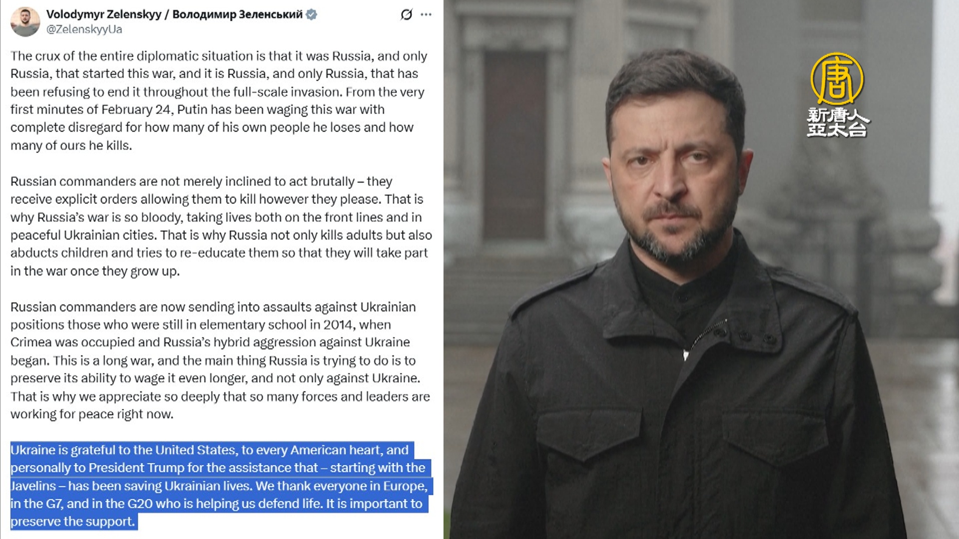 【新唐人亞太台 2025 年 11 月 24 日訊】美國、烏克蘭、歐洲官員週日齊聚瑞士日內瓦,討論美方提出的結束俄烏戰爭的28點方案,最新消息,烏克蘭總統澤倫斯基發文表示,他非常感激許多國家致力促成和平,烏克蘭「感謝美國及每位美國人民」,他本人也「親自感謝川普總統所提供的協助」。