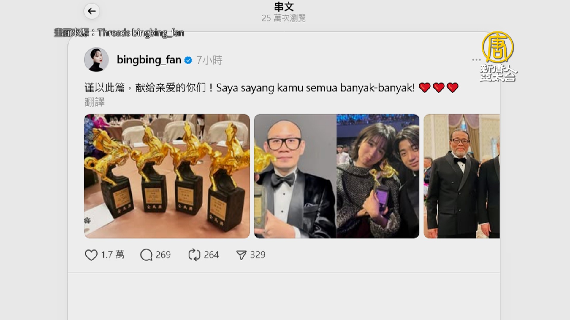 范冰冰金馬封后微博被消失!深夜Threads發文