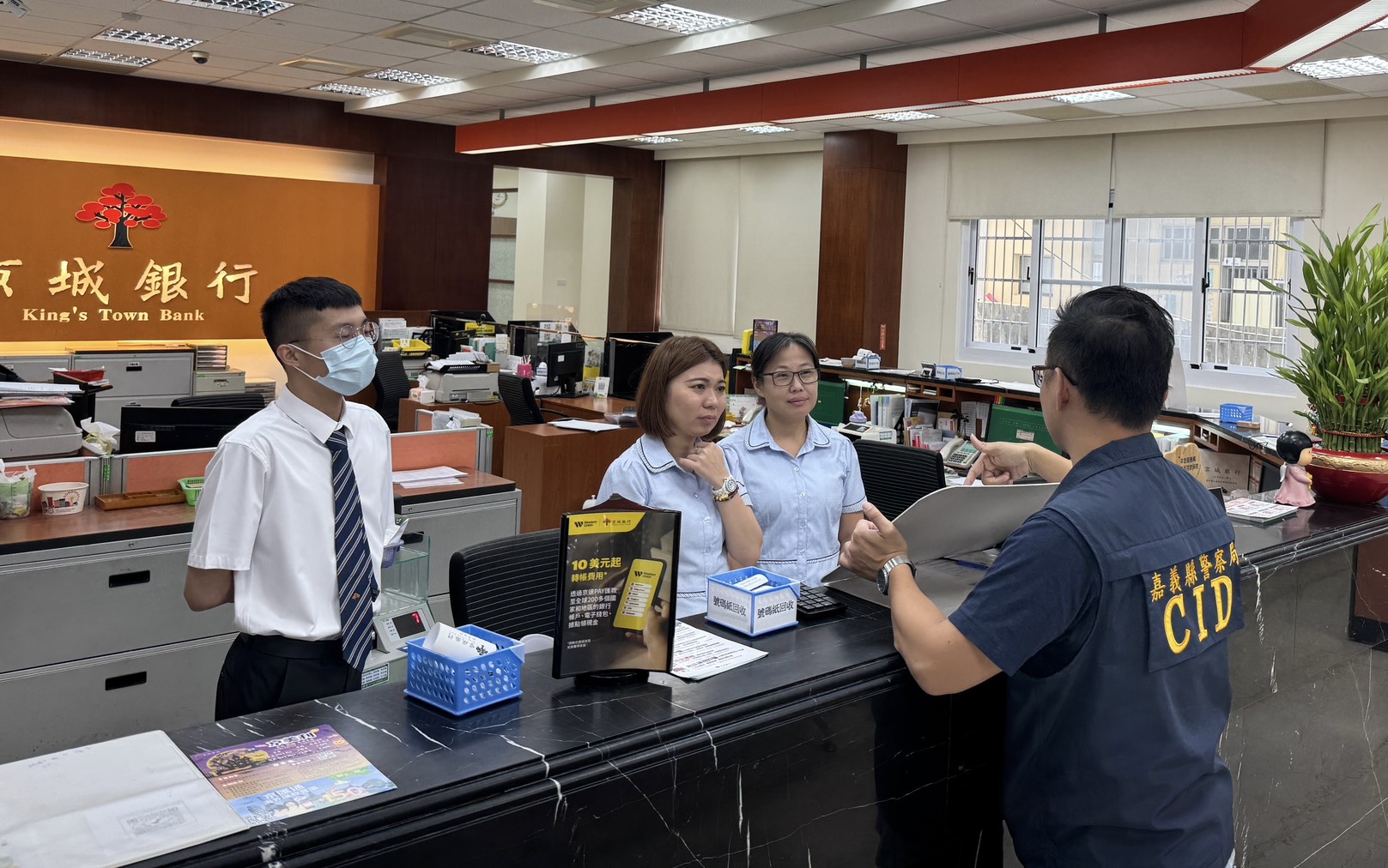嘉義縣朴子分局偵查隊,近日前往轄內銀行,辦理犯罪預防宣導活動。(朴子分局提供)