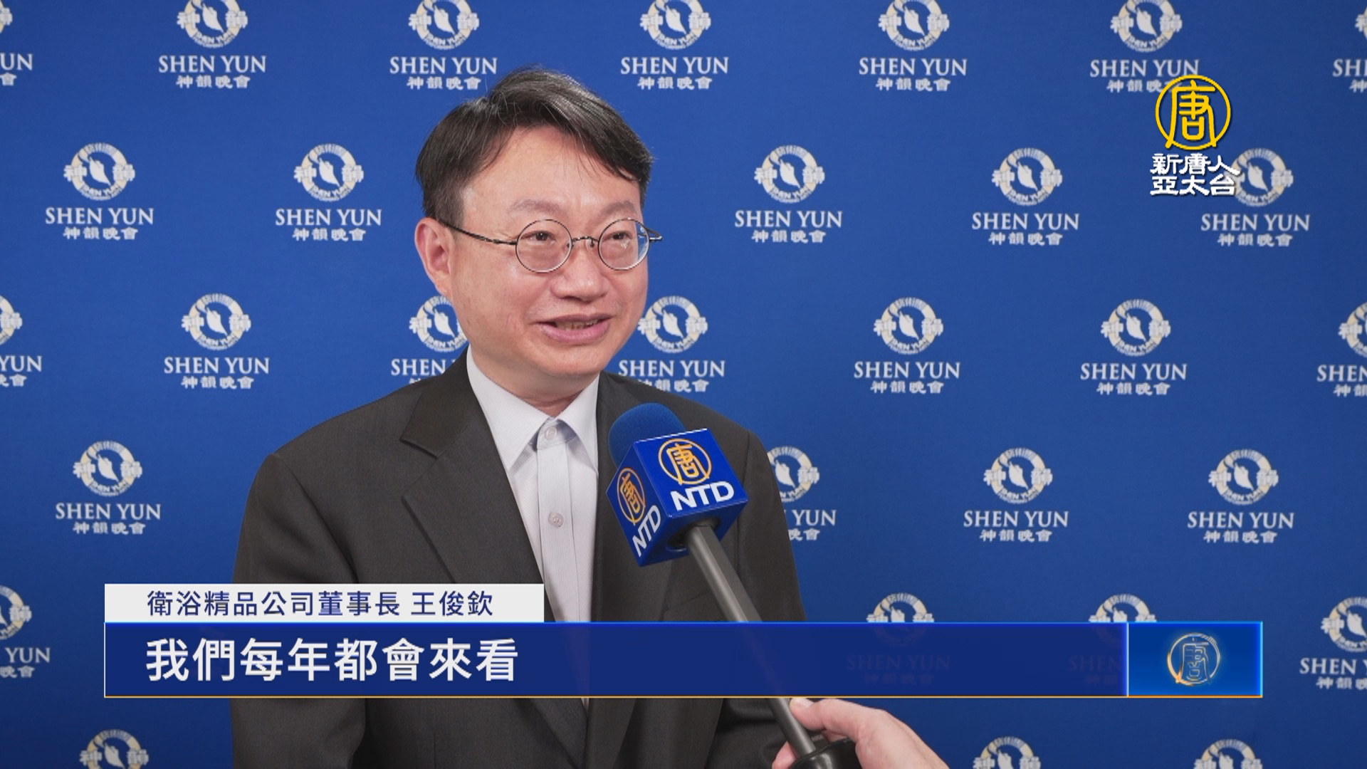 衛浴精品公司董事長 王俊欽:「神韻藝術團的演出,都覺得非常的精湛,那些舞蹈都非常的高超,還有天幕的結合,那個技術,到現在我一直想不透說,為什麼有辦法演員跳下去之後,就變成從螢幕上來。」「十年前,我十年前就看了,十年前我就在想這個問題,到現在十年後我還是想不透這個問題,對,非常的厲害。」