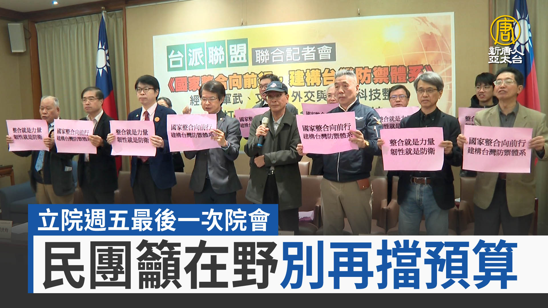 【新唐人亞太台 2026 年 01 月 26 日訊】立法院即將在這個禮拜五,舉行本會期最後一次的院會,然而,不管是政府的總預算案,還是國防特別預算,現在都還沒辦法付委審查。民間團體今天(26日)也召開記者會,強調預算對國家整體運作的重要性,呼籲在野黨,不要再擋預算了。