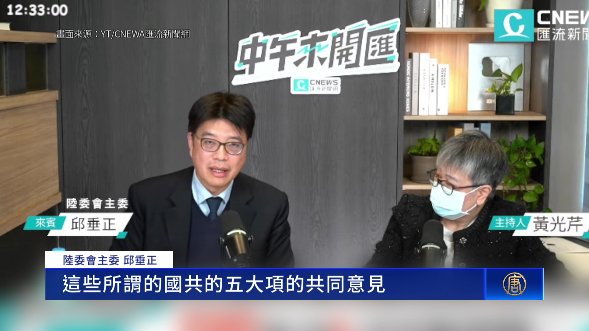 陸委會主委 邱垂正:「對岸對於我們的敵意是有增無減的情況底下,加上最近他又在清理高層的軍事人員像張又俠,大規模的清理,可以說是文革以來我們看到最大規模的整肅的情況底下。在這樣的一個關鍵,你要去跟人家進行這種國共論壇,站在陸委會的角度,我們是深表遺憾。您剛剛說他也簽回來了五個領域,但是我們也發現這些所謂的國共的五大項的共同意見,我們覺得它還是在譴責我們執政的政府,比如說阻礙兩岸的交流、觀光客、直航,我覺得這個倒果為因,我們不能接受。」