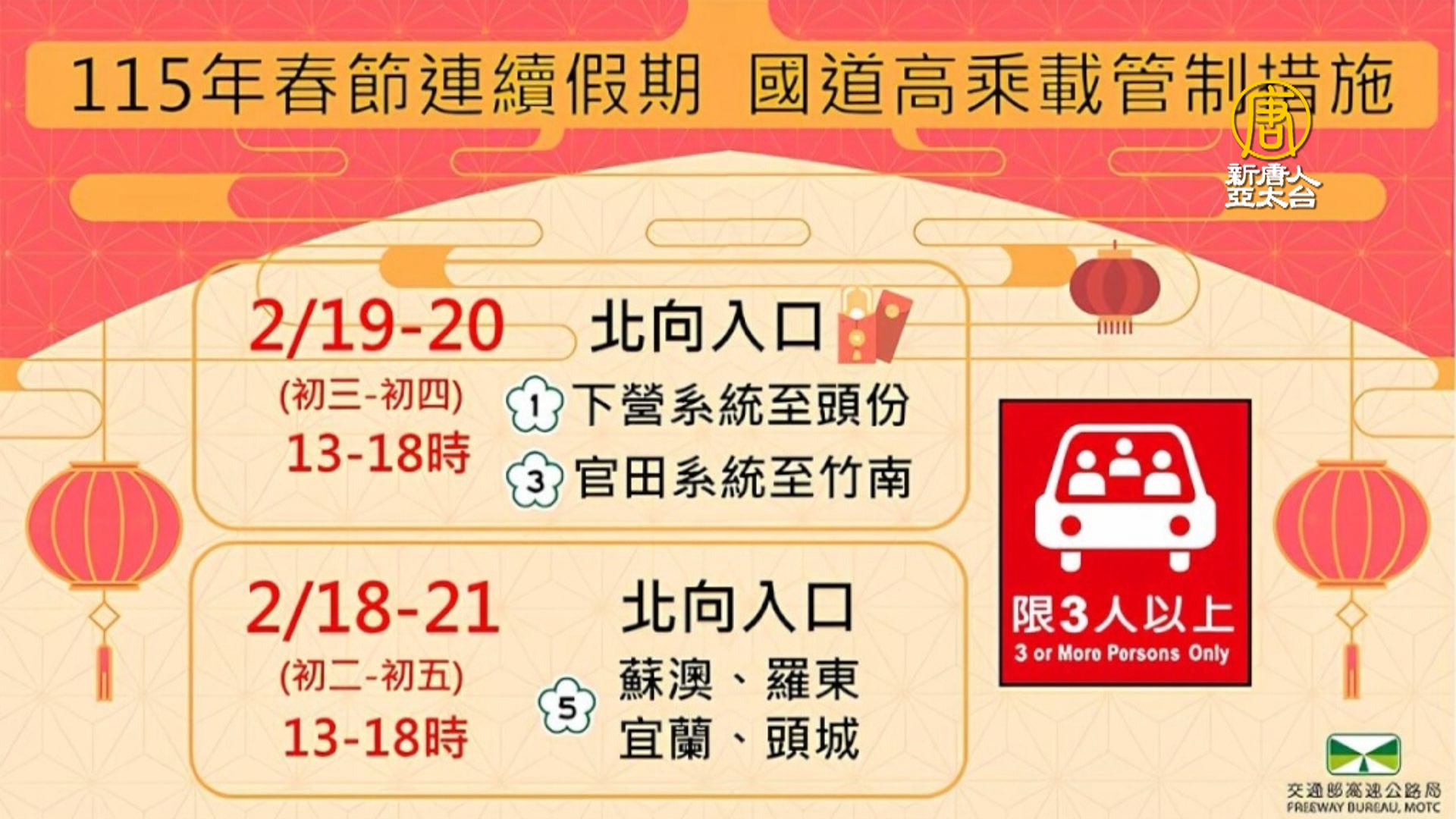 【新唐人亞太台 2026 年 02 月 13 日訊】明天就要迎接9天過年連假,不少民眾今天就開始準備返鄉。高速公路局指出,為了有效分散國道車流,國一、國三北向,將在初三、初四實施高乘載管制,而國五北向將在初二到初五實施。高公局預估,國5北向宜蘭路段,將在初三、初四上午9點、10點開始壅塞,持續到隔天的凌晨,呼籲北返用路人儘量提早出發。