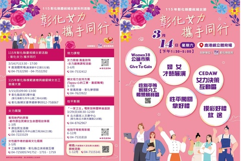 3月15日辦理115年彰化縣模範婆媳與績優婦女志工表揚大會,「女力展翅 鳳凰助飛」女力創業課程活動、彰化女路走讀、女力展覽、性別平等教育影展、性別平等講座、婦癌篩檢、各類紓壓及培力課程等活動也陸續展開。
