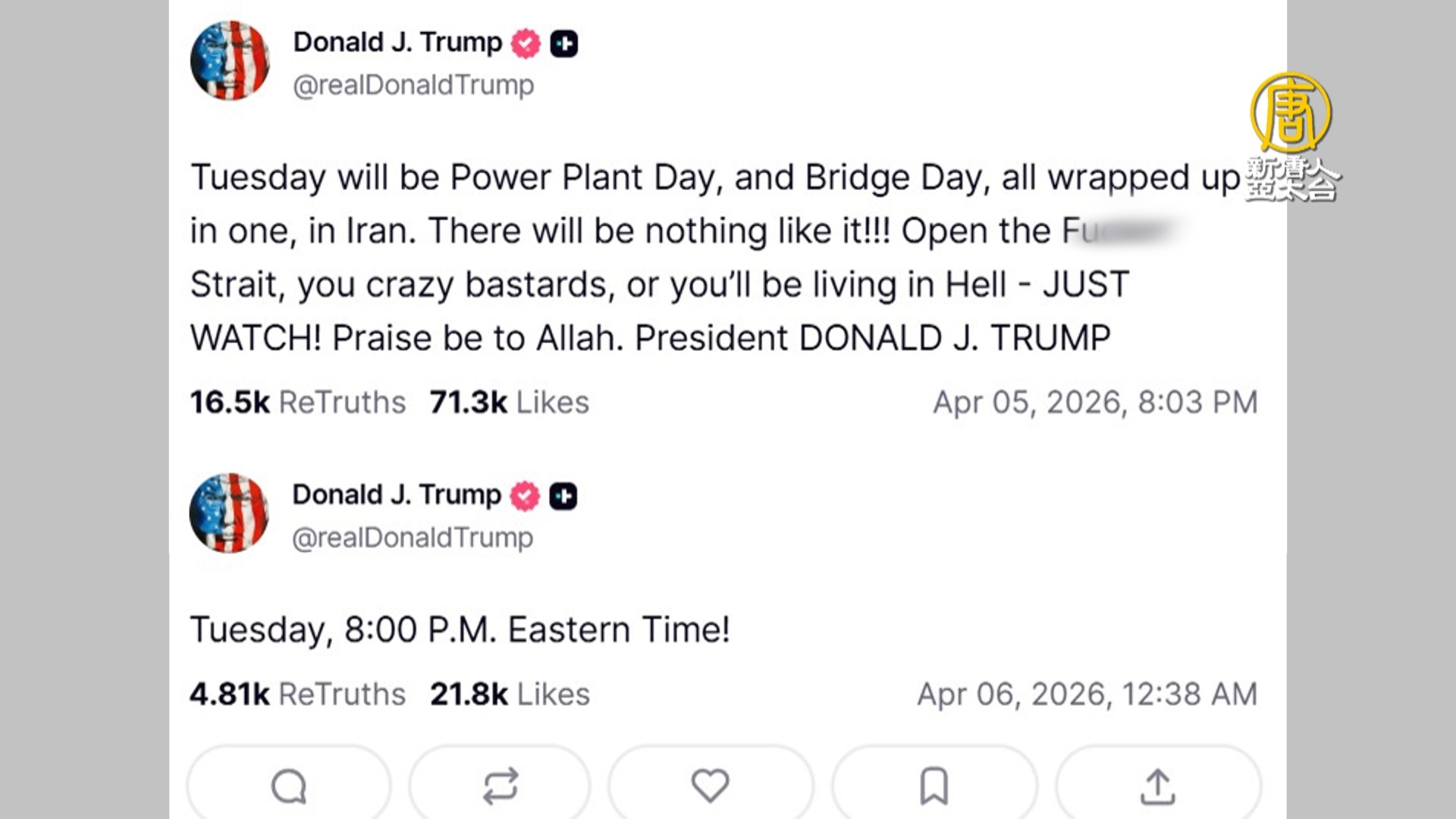 【新唐人亞太台 2026 年 04 月 06 日訊】美軍在伊朗絕地救援任務成功後,美國總統川普週日(5日),發出一篇措辭嚴厲的文章,指出說,「週二將是伊朗的,發電廠和橋梁之日,這一切將同時發生,絕對前所未見」,他進一步嚴厲說,開放那條該死的海峽,你們這群瘋子,否則你們將深陷地獄」。後來,川普還發文寫道,「美東時間週二(7日)晚間8點!」這則發文沒有提到伊朗或其他細節,但被認為可能就是指,開放海峽的最後期限。
