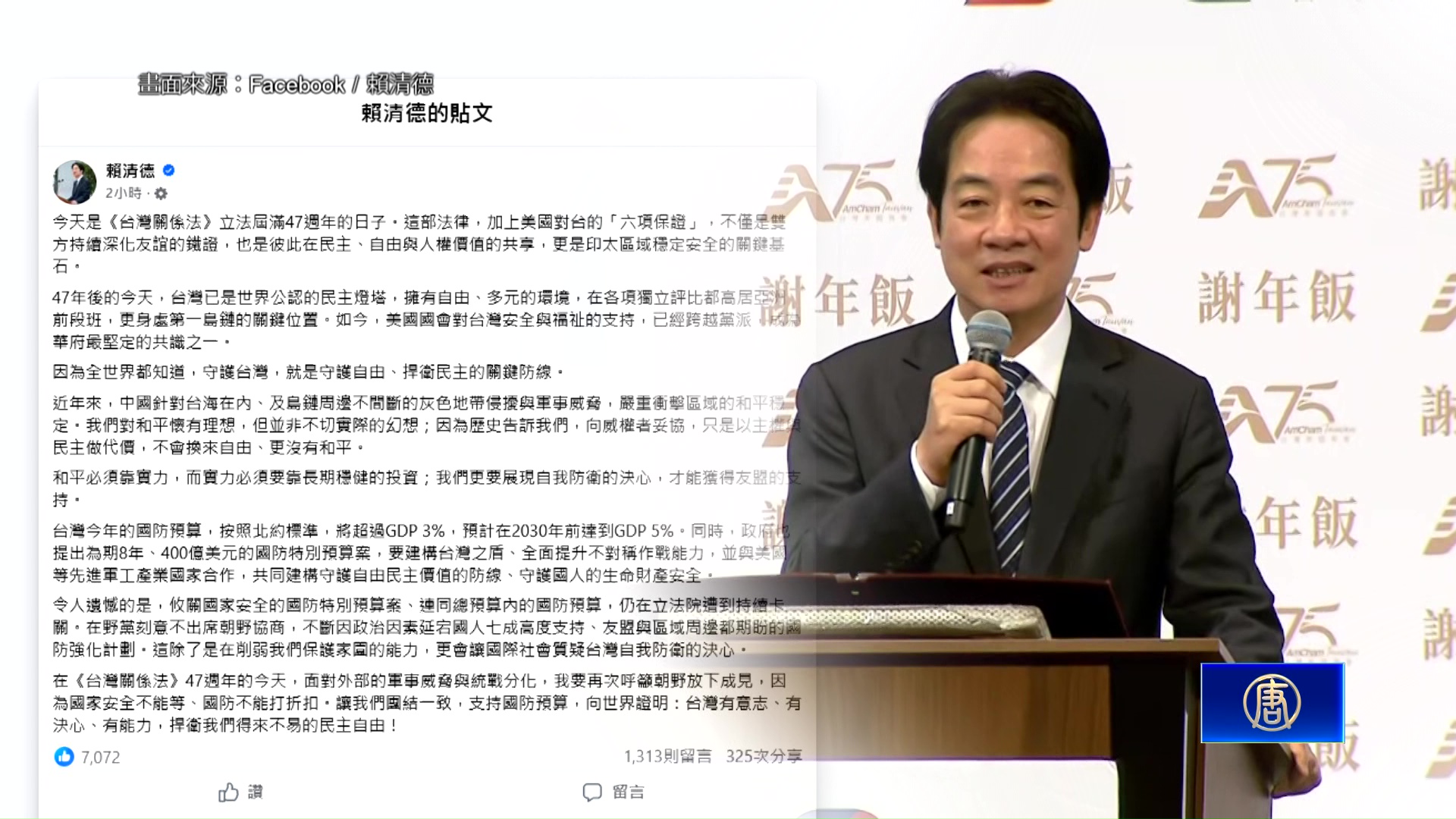 【新唐人亞太台 2026 年 04 月 10 日訊】台灣國民黨主席鄭麗文訪問中國大陸,今天(10日)上午11點與中共黨魁會面。對此,中華民國總統賴清德今天在社群平台發文表示,今天是《台灣關係法》立法屆滿47週年的日子,台灣對和平懷有理想,但並非不切實際的幻想,因為歷史告訴我們,向威權者妥協,只是以主權與民主做代價,不會換來自由、更沒有和平;賴總統也呼籲,朝野放下成見,團結一致,支持國防預算,向世界證明:台灣有意志、有決心、有能力,捍衛我們得來不易的民主自由。