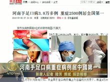 2010-05-07 22:09:42中國河南省手足口病近期向豫北蔓延,各大醫院人滿為患,截至4月30號,已有17名患兒死亡,3.8萬多例病例,居全國第三,重症2500例居全國第一。