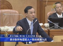 2016-05-31 20:42:18新北市長朱立倫在總統大選後 ,今天首度回到議會接受總質詢,民進黨議員,把先前 朱立倫請假時候 做的人形立牌 拿下來,開玩笑說,終於可以質詢到, 真人版市長。