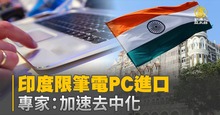2023-08-05 14:28:27印度政府3日宣布,對筆電、平板和個人電腦((PC))實施進口許可制,立即生效。影響蘋果((Apple))、戴爾((Dell))和三星((Samsung))等品牌大廠,包括台廠宏碁、華碩。專家分析,與印度總理莫迪推動的印度製造有關,這一項限制措施,也將加速供應鏈「去中化」。