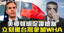 2021-05-08 10:12:47週五(5月7日)美國國務卿安東尼‧布林肯呼籲世衛總幹事譚德塞邀請台灣,以觀察員身分參加世界衛生大會(WHA)今年年度會議。