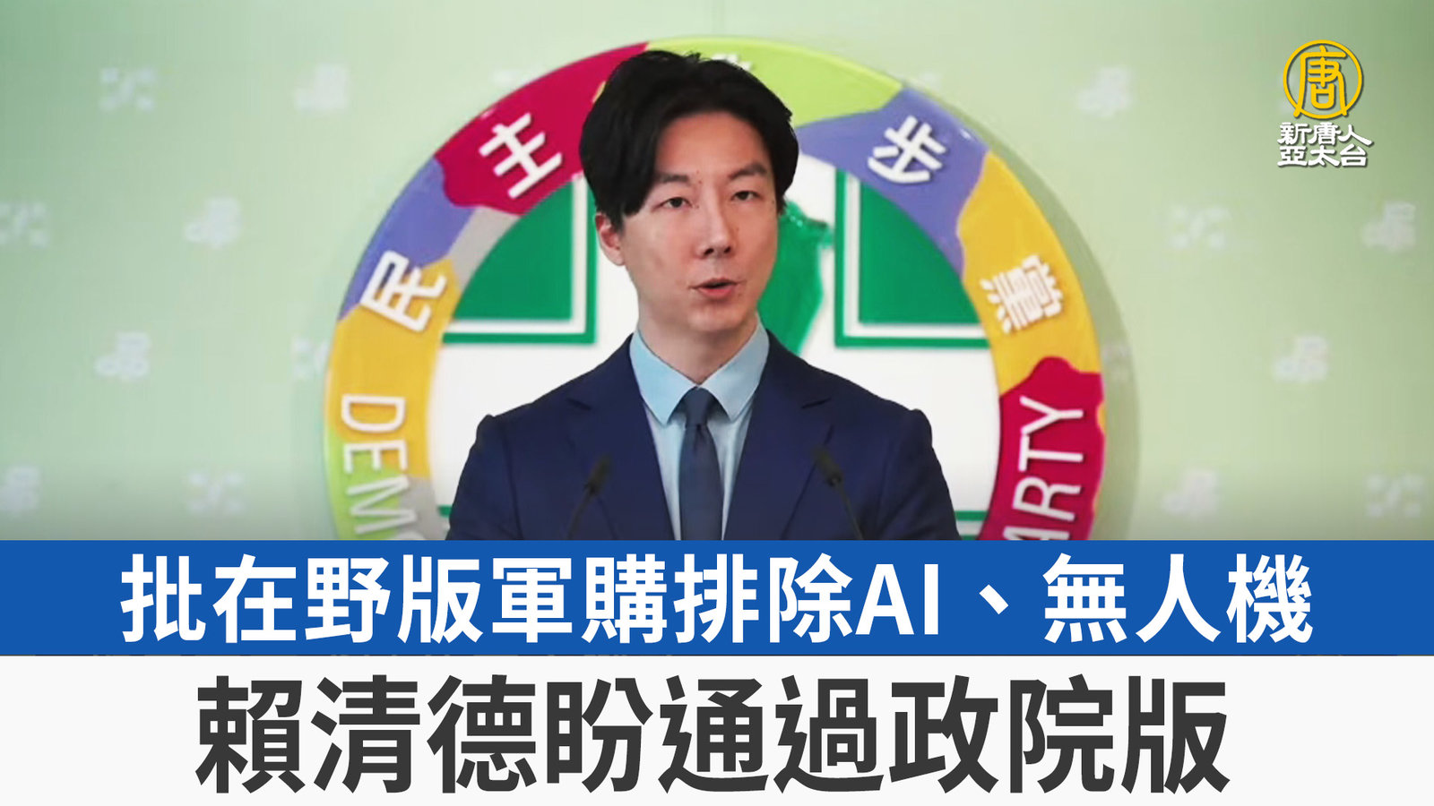 台灣也要展現決心守護台海,台灣立法院這禮拜,正在併案審查「國防特別預算條例草案」,中華民國總統賴清德,今天在民進黨中執會指出,在野黨將現代戰爭最核心的AI 輔助與無人機系統排除在預算案之外,恐怕與國際戰略趨勢存在嚴重落差,呼籲朝野應尊重專業,支持具備六成民意基礎的行政院版草案。 //www.ntdtv.com.tw/public/uploads/assets/2026/03/25/2026-03-25-69c3c70bb73bf-220x123-169.jpg 軍購|賴清德2026-03-25 20:32:12