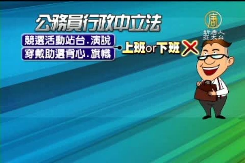 二合一選戰正式開跑,公務員保訓會最近也正積極加強公務員的教育訓練,提醒大家要行政中立,不管上下班時間,或是放假,千萬都不能替特定的候選人助選站台,或者是主辦遊行活動,要公務員別踩到行政不中立的紅線,否則就會依法懲處。 //asset3.ntdtv.com.tw/public/uploads/video/2011/07/27/20110727-3643486.flv 公務員|助選|行政中立|上下班|台北2011-07-26 21:46:50