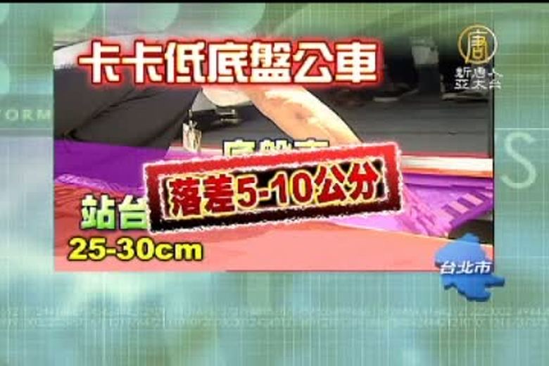 台北市政府為了輪椅族,5年花了16億多補助低底盤公車,不過有身障者向議員陳情,捷運局在南京東路施作松山線,但是把公車站的月台做太高,跟低底盤公車的無障礙鐵板有5公分以上的落差,讓他們輪椅經過的時候,不小心就會摔倒。 //asset1.ntdtv.com.tw/public/uploads/video/2011/07/28/20110728-3661985.flv 低底盤公車|月台|輪椅族|台北2011-07-27 22:19:57