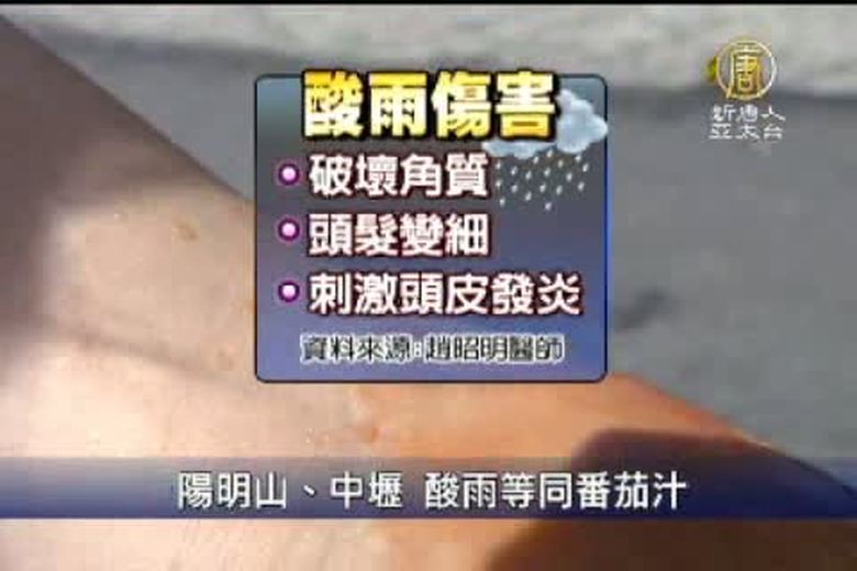 環保署公布去年酸雨檢測結果,北台灣5個測站,雨水平均pH值低於5,雨水酸度僅次於中國,是東亞第二酸,陽明山鞍部和桃園中壢更嚴重,酸度等同於番茄汁,直逼醋等級,醫師就警告,酸雨可能刺激頭皮發炎,民眾最好小心防範。 //asset3.ntdtv.com.tw/public/uploads/video/2011/07/28/20110728-3661987.flv 酸雨|陽明山|中壢|酸度|番茄汁2011-07-27 21:19:15