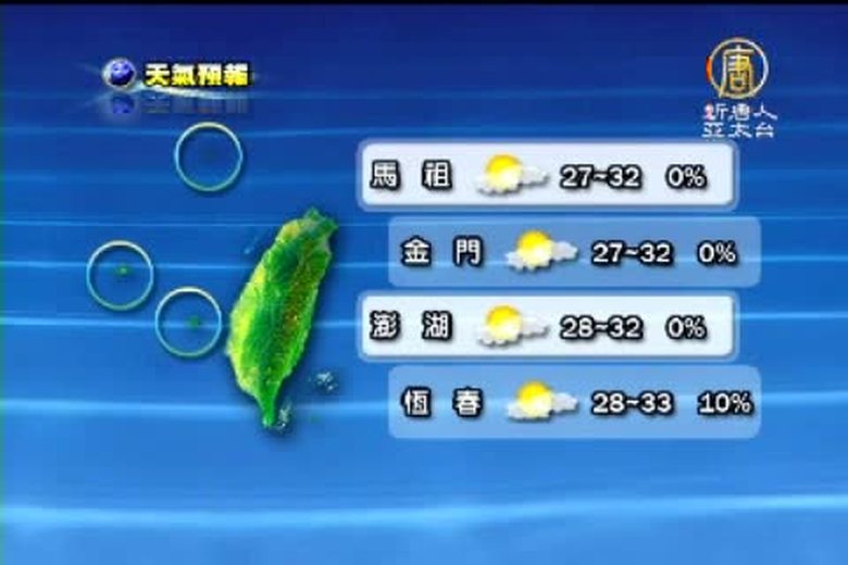 來關心天氣。氣象局指出,週三之前,梅花颱風對台灣還不至於有影響,全台天氣相對穩定,但全台仍是高溫炎熱天氣。以下帶您關心8月2日星期二的天氣預報。 //asset1.ntdtv.com.tw/public/uploads/video/2011/08/02/20110802-3759284.flv 2011-08-01 21:58:19
