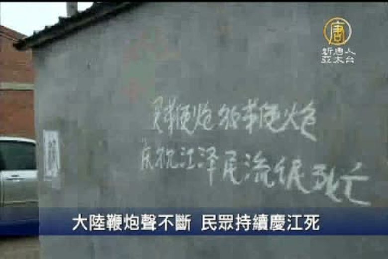 自今年7月初海外媒體報導中共前黨魁江澤民的死訊,大陸民眾通過各種管道瞭解到這一消息後,用放鞭炮、煙花的形式,表達自己的喜悅心情,各地燃放鞭炮、煙花持續至今。 //asset1.ntdtv.com.tw/public/uploads/video/2011/08/19/20110819-4041705.flv 江澤民|死訊|放鞭炮|法輪功|中共2011-08-18 21:27:35