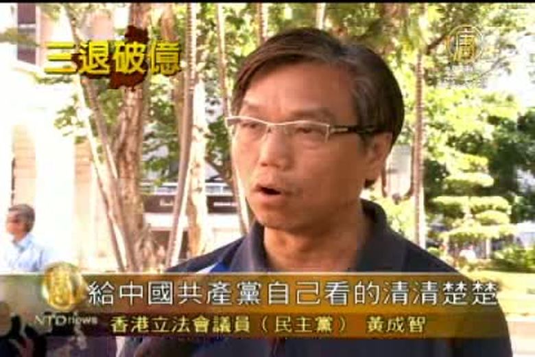 在今年8月7日這一天,在大紀元網上宣佈退出中共"黨、團、隊"的人數達到一億人。香港民主黨議員黃成智認為,中共應該意識到自己的管治危機,將權力交回人民,讓人民選出自己喜歡的政黨和政府。 //asset2.ntdtv.com.tw/public/uploads/video/2011/08/19/20110819-4041700.flv 退黨|一億|三退|中共|香港2011-08-18 21:29:20