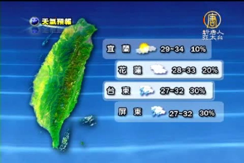 今天全台各地持續晴朗炎熱的天氣,中央氣象局表示,高壓勢力開始些微減弱,受到南方水氣移入影響,明/後二天東南部地區有局部短暫陣雨,中南部地區及北部山區午後有局部短暫雷陣雨,其他地區為多雲到晴。以下帶您關心8月20號星期六的天氣預報。 //asset3.ntdtv.com.tw/public/uploads/video/2011/08/20/20110820-4058983.flv 2011-08-19 21:57:53