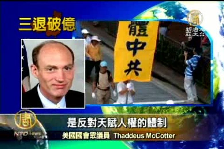 中國民眾退出中共黨團隊組織人數超過一億﹐令世界矚目。曾擔任美國共和黨政策委員會主席的國會眾議員麥考特認為﹐一億人三退代表著中國人民向自由邁進了一大步。 //asset3.ntdtv.com.tw/public/uploads/video/2011/08/21/20110821-4080824.flv 退黨|中共|三退2011-08-20 21:23:48