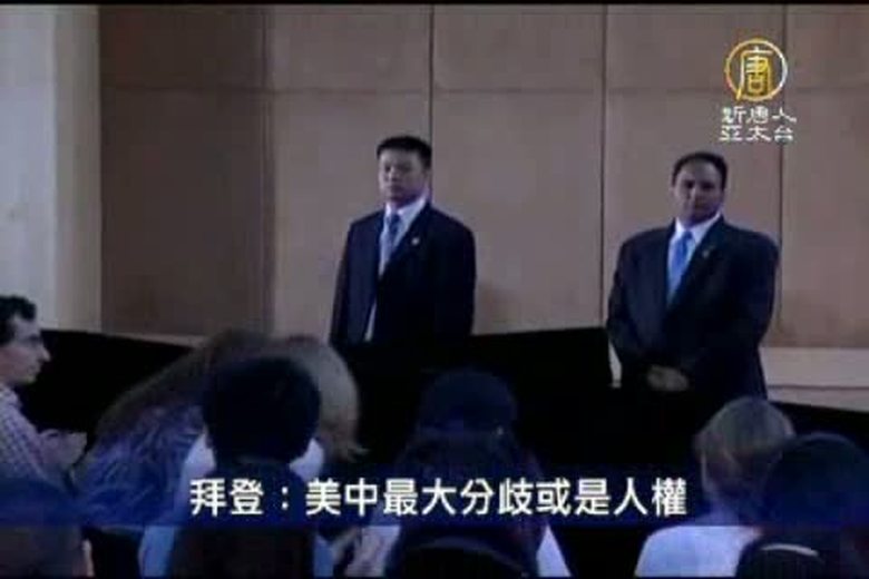 在中國大陸訪問的美國副總統拜登,今天(21日)上午在成都四川大學發表演講時表示,美中關係在全球發展中至關重要;不過拜登也表示,美中存在「最大的分歧也許就是人權」。今天是「拜登」訪問中國大陸的最後一天,他在四川大學發表演講,他重申,中國身為美國國債的最大持有人,中國所持的美債安全無虞。至於美中之間的分歧,拜登說,最大的分歧也許就是人權。他強調,美國不打算干涉別國,美國人愛護自己珍視的價值,也希望中國大陸通過人權的發展能變得更自由,獲得社會進步。今天的演講現場約有400多人。 //asset3.ntdtv.com.tw/public/uploads/video/2011/08/22/20110822-4089014.flv 美國副總統|拜登|四川|人權|美國國債2011-08-21 21:16:28