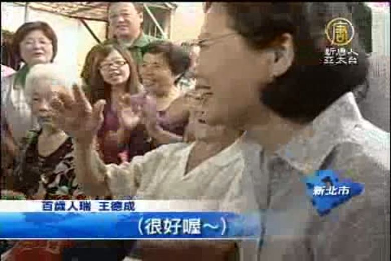 民進黨總統參選人蔡英文全台鄉鎮跑透透,今天(21日)來到新北市樹林區,拜訪103歲人瑞王德成,提前替他祝賀104歲生日。王老先生全家都是蔡英文的粉絲,這回蔡英文來訪,不但全家五代全部到齊,連附近的居民都來湊熱鬧,把小小的三合院擠得水洩不通,場面非常熱鬧。 //asset3.ntdtv.com.tw/public/uploads/video/2011/08/22/20110822-4089006.flv 蔡英文|王德成|人瑞|慶生|新北市2011-08-21 21:06:26