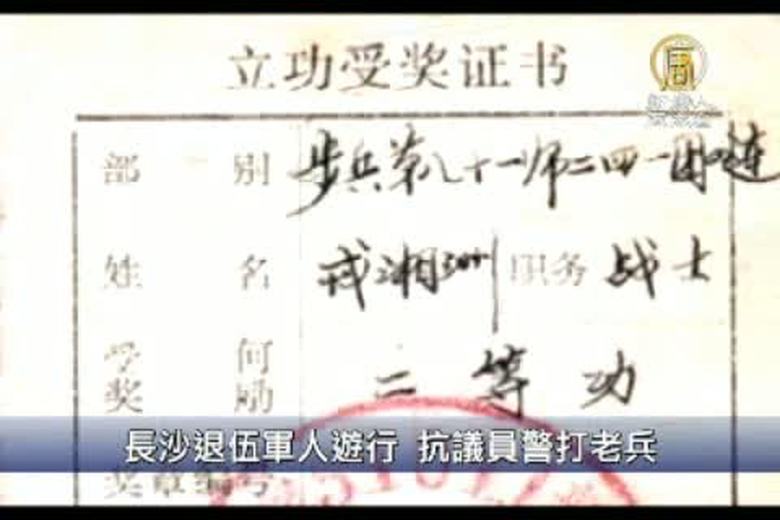 25日下午,湖南長沙發生200多名退伍軍人上街遊行事件,抗議當地民警惡意打傷傷殘老兵。該事件不僅令當地退伍軍人憤怒,目前也引起全國退伍軍人的關注。 //asset3.ntdtv.com.tw/public/uploads/video/2011/08/29/20110829-4203220.flv 戎湘洲|眾怒|集體遊行|退伍軍人|殘疾|湖南|長沙2011-08-28 21:23:47