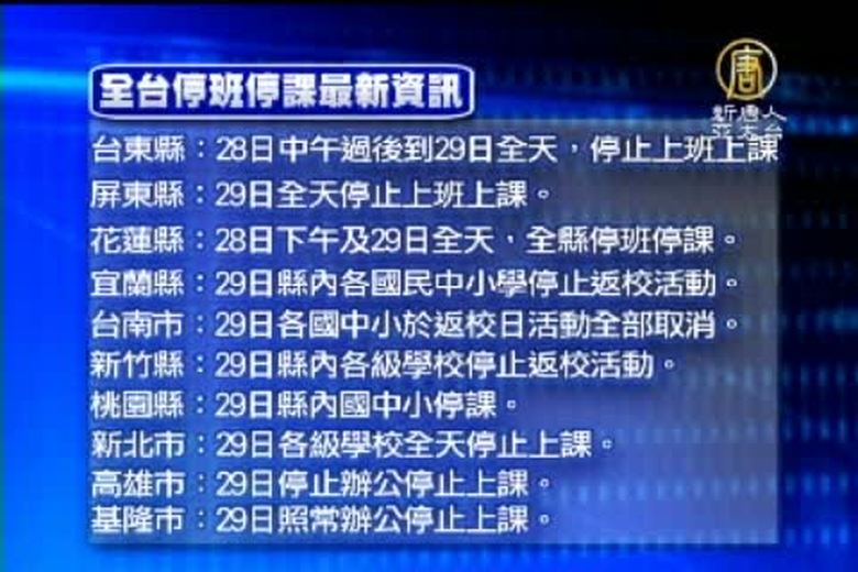 中颱南瑪都挾帶大量水氣逼近台灣,全台各縣市停班停課狀況如下。 台東縣、屏東縣、花蓮縣三個縣市,全部停止上班上課。 基隆巿、宜蘭縣、新北市、桃園縣、新竹縣、台南市、高雄市等縣市的國中小停課及並停止返校活動 //asset3.ntdtv.com.tw/public/uploads/video/2011/08/29/20110829-4205584.flv 2011-08-28 21:05:35