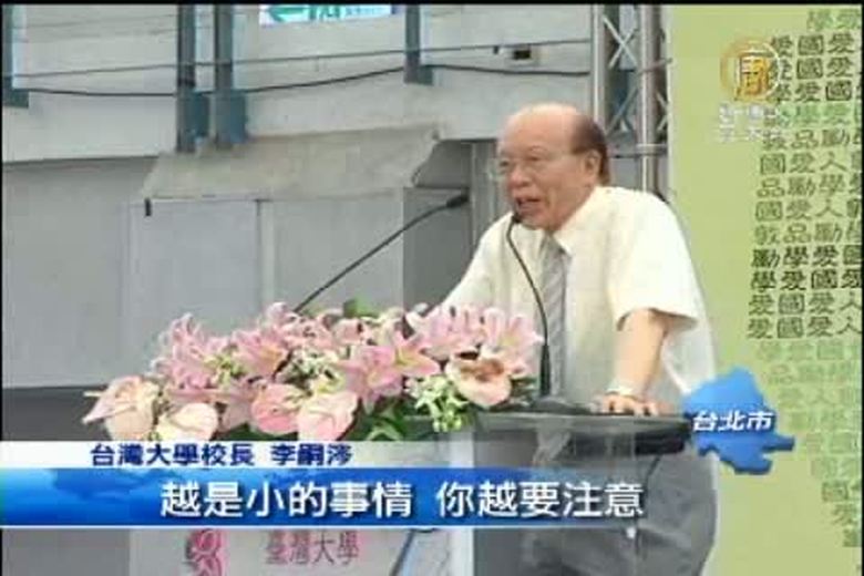 台灣大學在昨天舉行新生訓練,校長李嗣涔演講時勉勵新生「考試不作弊、作業不抄襲、不隨便蹺課、不隨便亂停腳踏車」,引發網友說,怎麼校長的願望這麼小。也有社會人士認為,念大學了還要被叮嚀基本教養,反映了台灣的大學真的是高中化。 //asset1.ntdtv.com.tw/public/uploads/video/2011/09/07/20110907-4345280.flv 品德教育|李嗣涔|台大|新生勉勵2011-09-06 21:47:25