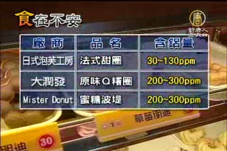許多人喜歡把甜甜圈當成早餐或下午茶甜品,但是甜甜圈、油條、饅頭、海帶等,這些隨處可見的食物,在消基會抽檢的24件樣品中,有16件含鋁,比例達六成 七。對於成長中的兒童或是青少年,如果攝取過多的鋁,恐怕智力及記憶力會衰退。 //asset3.ntdtv.com.tw/public/uploads/video/2012/04/08/20120408-7768598.flv 甜甜圈|油條|鋁含量|神經病變2012-04-07 21:46:23