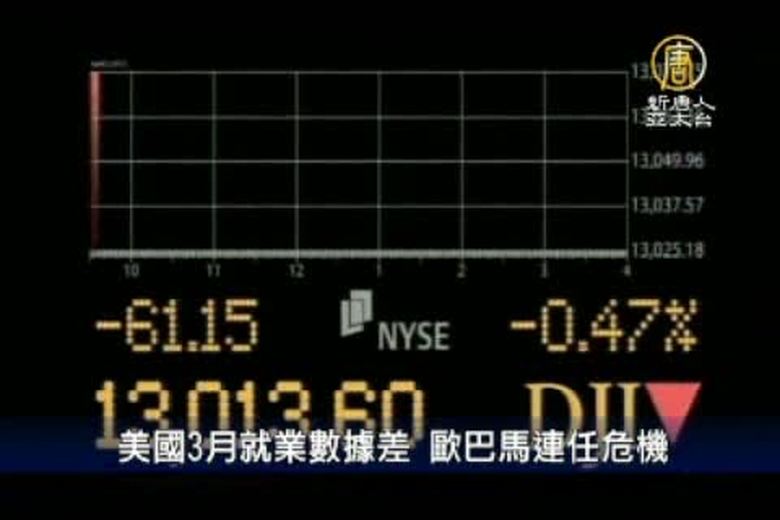 美國勞工部6日公布,3月的非農就業人數新增了12萬人,遠低於市場預期。不過失業率降到了8.2%,是2009年1月以來的最低點。儘管如此,這些數據還是為歐巴馬競選連任蒙上了一層陰影。 //asset2.ntdtv.com.tw/public/uploads/video/2012/04/08/20120408-7770251.flv 歐巴馬|羅姆尼|非農就業數據|白宮|失業率2012-04-07 21:38:51