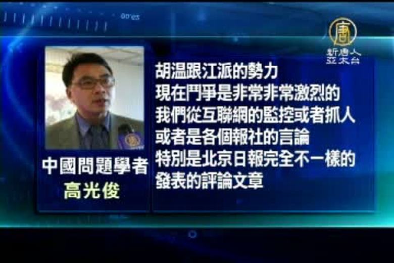 由北京市委書記劉淇控制下的官媒《北京日報》,在胡錦濤出訪外國期間,高調發表文章「總書記不能凌駕中央」,但文章被悄悄撤下後,4月5號《北京日報》又出現一篇「牢記胡錦濤總書記的囑託」。有分析認為,《北京日報》在胡錦濤出訪期間公開談黨的總書記並不是權利的最高機構,可以看出中共背後的高層內鬥已經呈現攤牌的跡象。 //asset3.ntdtv.com.tw/public/uploads/video/2012/04/08/20120408-7772284.flv 劉淇|北京日報|胡錦濤|中共2012-04-07 21:33:46